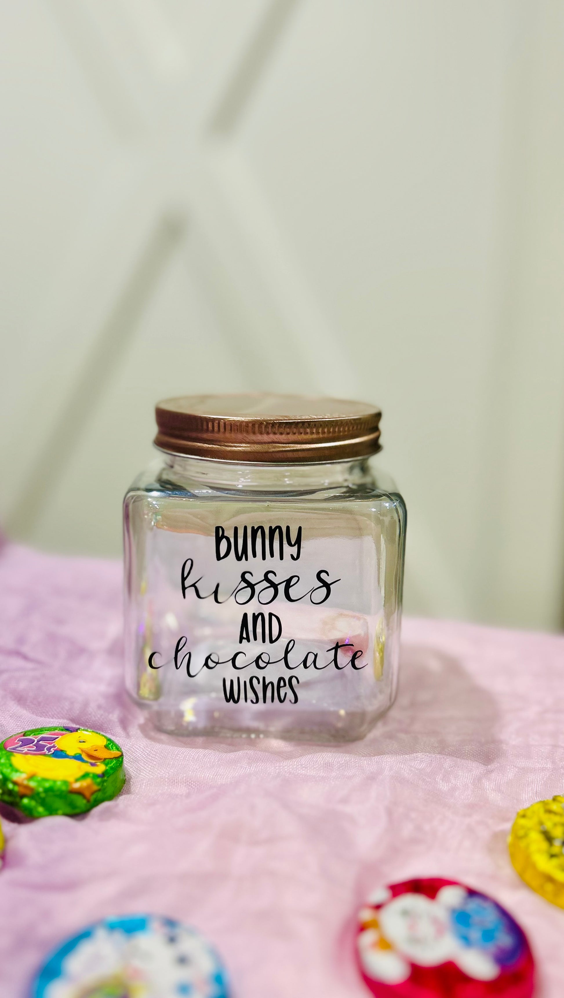 This charming square glass jar with a rose gold lid is the perfect way to spread love and sweetness! Featuring the adorable phrase "Bunny Kisses & Chocolate Wishes," you can fill it with chocolate kisses, making it the sweetest gift for Easter, springtime celebrations, or just because!